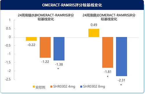 图4 艾玛昔替尼组与安慰剂组OMERACT-RAMRIS评分较基线变化情况